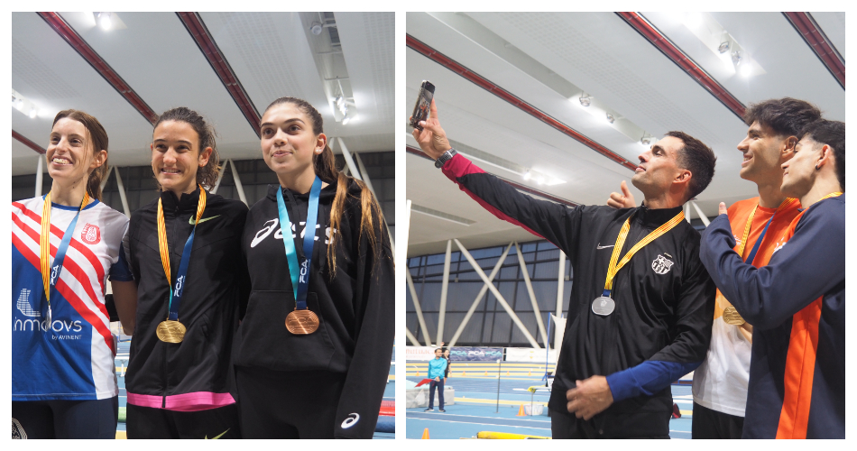 A la perxa, segon or consecutiu de Clara Fernàndez, amb excel·lent marca de 4.20 m, seguida de la també campiona catalana Meritxell Benito, amb la plata i 3.95 m i el bronze de Mònica Clemente amb 3.85 m. A la llargada, nou títol d’Andreea Florina Sabou amb marca de 6.15 m, i segona medalla després dels 60 mll. La també campiona, Clara Gabaldón va ser tercera amb 5.94 m, doncs la plata va recaure a Adriana Curto, la joveníssima medallista, en edat sub 18, amb 5.99 m.